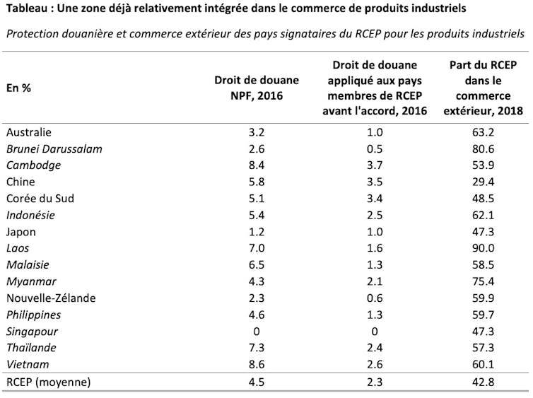 Il reste qu’il s’agit d’un accord important, qui marquera une étape dans la consolidation de l’intégration commerciale de Asie de l’Est. En dépit de sa genèse, sa réalité commerciale sera nécessairement centrée sur la Chine, pour qui il s’agit indéniablement d’une victoire politique et diplomatique : finaliser cette négociation n’avait rien d’évident tant le climat régional reste lourd de tensions géopolitiques, mais aussi commerciales, comme en témoignent par exemple les aides financières déployées par le Japon pour diversifier ses chaînes de valeur en dehors de Chine, ou les mesures de rétorsion commerciale prises par la Chine contre l’Australie.