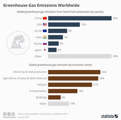 Les États-Unis, second plus gros émetteur de gaz à effet de serre (GES) au monde après la Chine, ont annoncé le 1er juin 2017 leur retrait de l’Accord de Paris. En 2014, les émissions mondiales de GES se sont élevées à 53,9 Gt de CO? eq : la Chine y a contribué à hauteur de 12,4 Gt et les États-Unis de 6,3 Gt (celles de l’UE atteignent les 4,7 Gt).