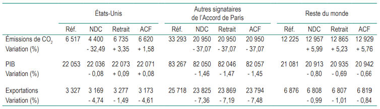 Nos simulations montrent qu’en sortant de l’Accord de Paris, les États-Unis émettraient 2,3 Gt de CO2 de plus qu’en respectant leurs engagements, soit 218 Mt de plus que dans un monde sans Accord, comme le souligne le tableau ci-dessous.